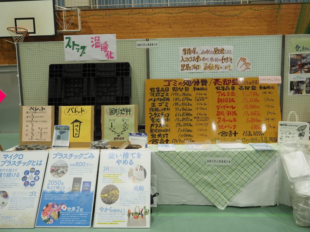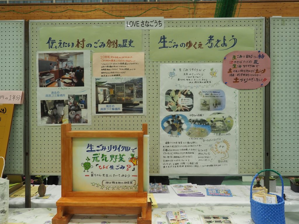 また、佐那河内村内の集積場に持ち込まれたゴミの見える化として、今年度も処分費用やゴミの売却益の金額を示し、如何に、ゴミの処分に出費が発生しているのか、そして、きちんと分別されれば資源・売却益につながることを分かりやすく伝えられていました。今年度は、「温暖化防止推進員の会」の展示の隣で、松長礼子さんが会長を務められている「Loveさなごうち」の展示も合わせて行われ、村のごみ分別の歴史について紹介されるとともに、村内の処分費の中でも処分費用が高い生ごみのリサイクルについて、佐那河内中学校での土づくり・花壇への活用や、その土で栽培された野菜の調理実習等の取組についても紹介をされていました。